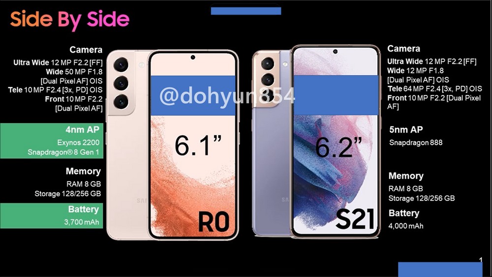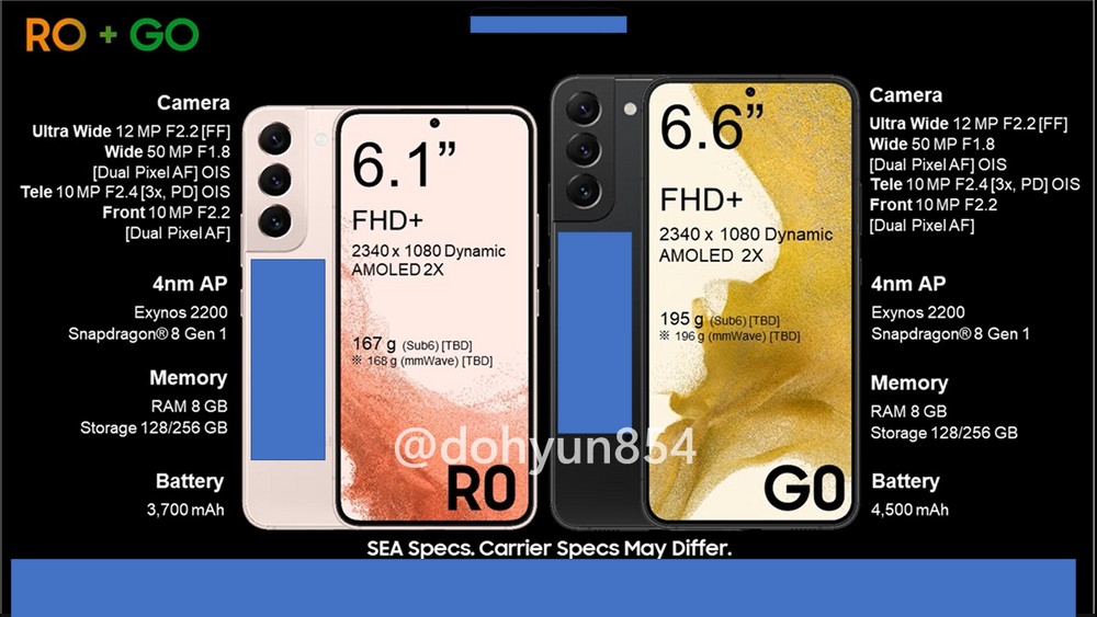 Oltre ai numerosi render, condivisi dall’utente Dohyun Kim su Twitter, è stato reso noto un video-spot che mostra precisamente le caratteristiche ed il design dei flahship in casa Samsung – salvo poi essere stato oscurato. Quel che emerge invece dai render sono informazioni preziose, da analizzare per capire cosa troveremo sotto il cofano di Samsung S22. Nello specifico, parlando di SoC, si fa menzione del Qualcomm Snapdragon 8 Gen 1, anche se in Europa, in molti, sono convinti che i dispositivi verranno rilasciati con un processore fatto in casa, vale a dire l’Exynos 2200.